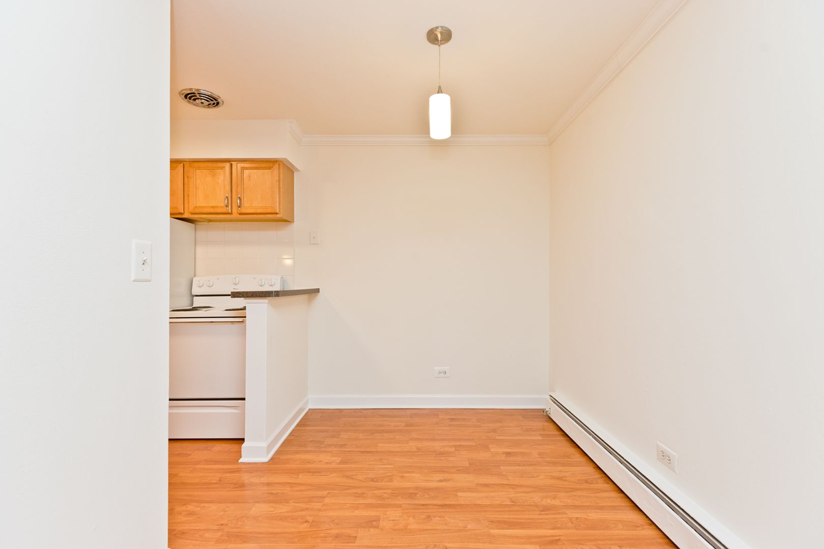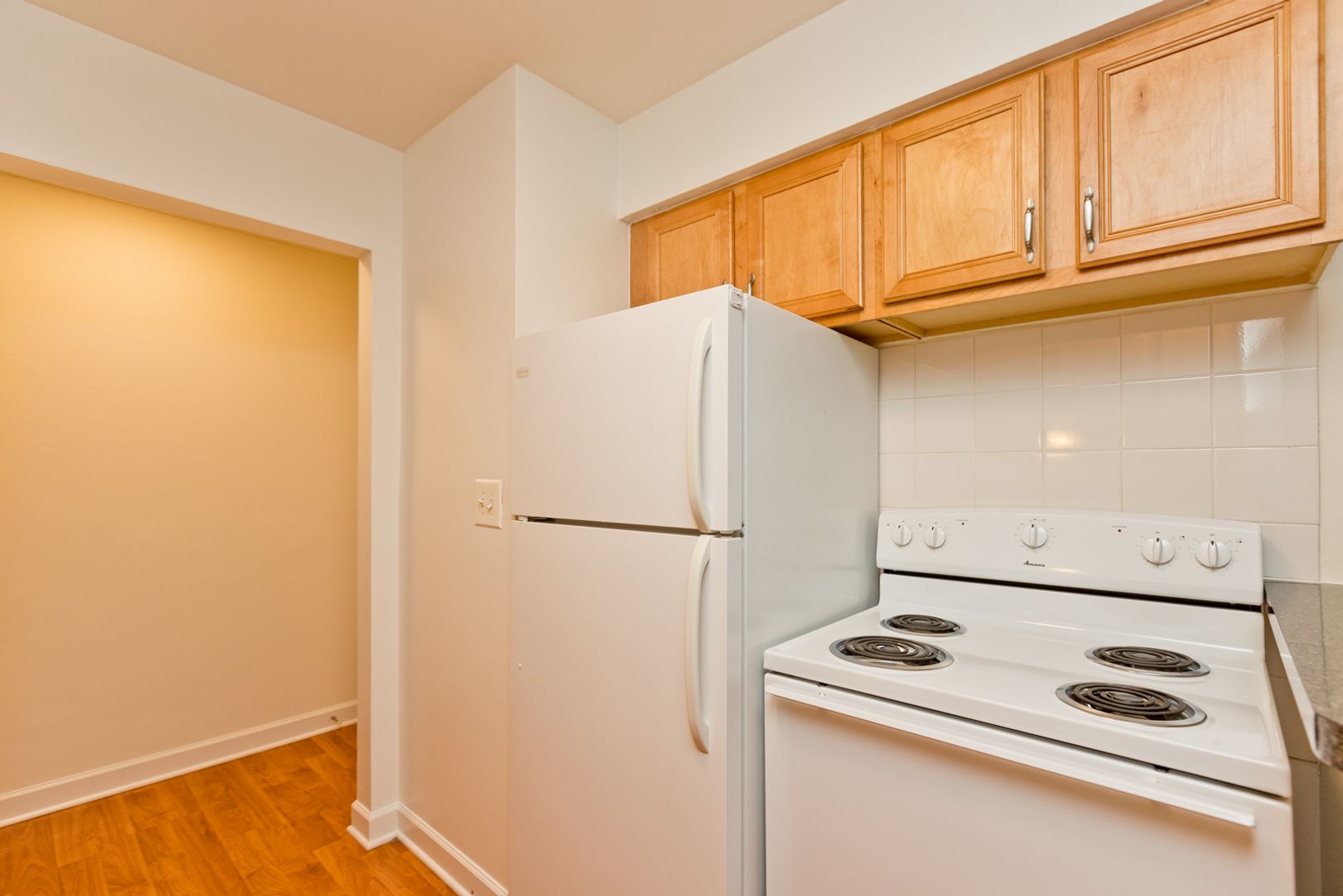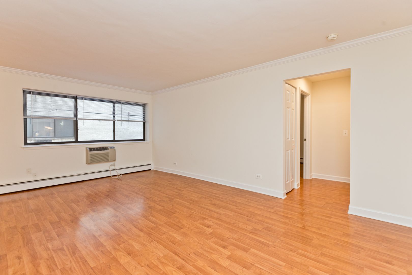 Galley-style pass-through kitchen with plenty of counter top and cabinet space, double-bowl sink, full-size electric stove, and refrigerator. Unbelievable closet space throughout the apartment; including a full wall of closet space in the bedroom, two linen closets outside of the bathroom, coat closet near the entrance, and floor-to-ceiling pantry in the kitchen. A/C units in the bedroom and living room, and much, much more!